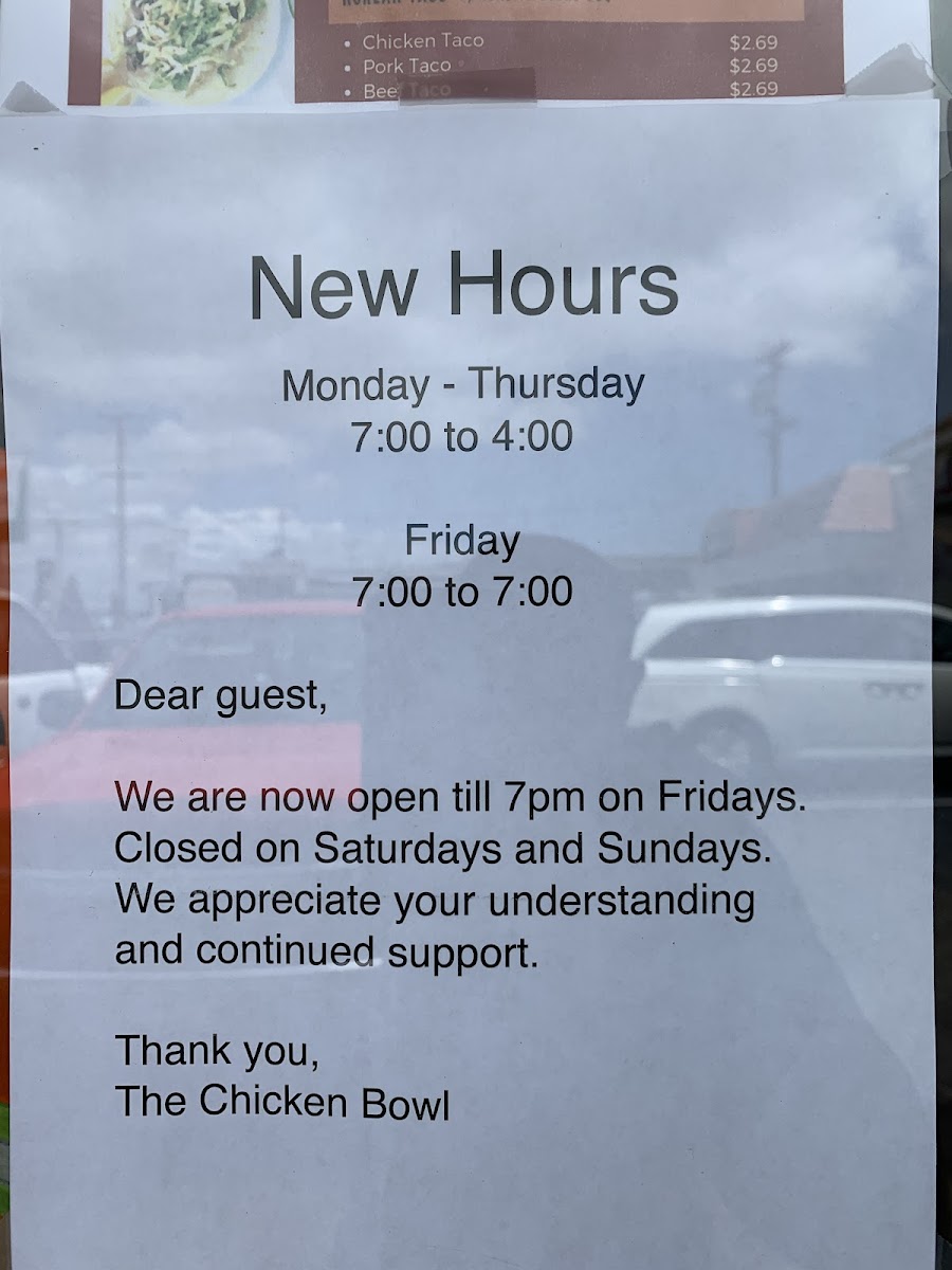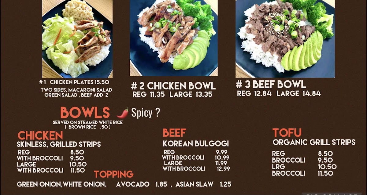 The menu at The Chicken Bowl offers a wide variety of delicious options, blending comfort food with Asian-inspired dishes. For breakfast, the Spam Bowl provides a hearty start to the day. The new Chinese food section introduces a selection of mouthwatering dishes such as Shrimp Chow Mien and Orange Chicken, along with sides like Tempura Shrimp (6 Pcs) and Egg Rolls (4 Pcs). For heartier meals, the plates section features tasty choices like the Chicken & Beef Plate, Beef Plate, and Chicken Plate, all complemented by options like the Tofu Plate for vegetarians. Those craving a more compact meal can choose from the Chicken Bowl Combo, Tofu Bowl Combo, or Beef Bowl Combo, each delivering satisfying flavors in a convenient serving. The salad options, including Tofu Salad, Chicken Salad, and Beef Salad, offer a lighter yet flavorful alternative. For sides, patrons can enjoy Brown Rice, Avocado, and Steamed Veggies, alongside a Green Salad or a vegetarian Egg Roll (4 Pcs). To wash it all down, the beverage options range from Squirt 20 Oz. to Gatorade Red, as well as Diet Coke and Pure Leaf Unsweetened Tea. The bowls section highlights favorites like the Tofu Bowl, Beef Bowl, and Chicken Bowl. The Yakisoba section also stands out with Tofu Yakisoba, Vegetable Yakisoba, Beef Yakisoba, and Chicken Yakisoba, offering diverse flavors to suit every taste. The Chicken Bowl’s menu is thoughtfully designed to provide a variety of options, ensuring there is something for everyone.
